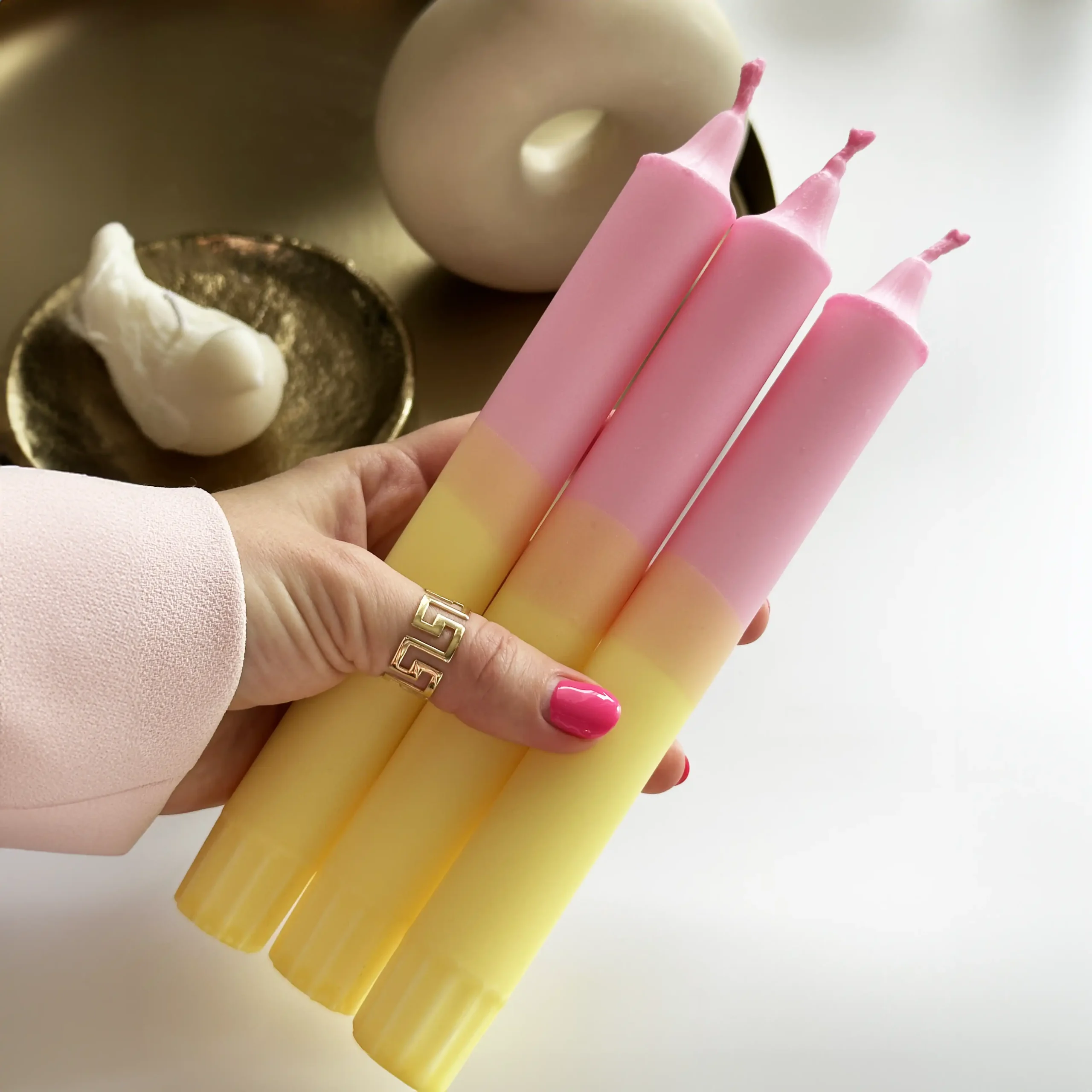 Add a cozy glow to your home with our handmade pastel candles in soft pink and yellow shades. Each candle is decorated with natural stearin, giving it a unique and elegant look.