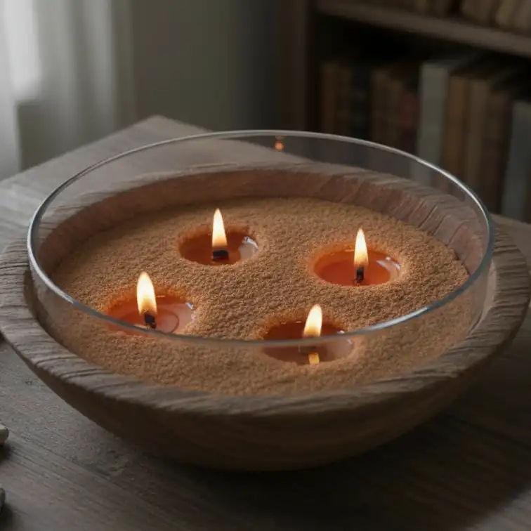 GYERTYA ELŐKÉSZÍTÉS: Öntsön egy legalább 5 cm magas réteget egy nem éghető edénybe. A tartály átmérőjének legalább 8 cm-nek kell lennie. Helyezze be az egész kanócot a megszórt rétegbe, és hagyjon 1 cm-t kilógni pamut kanóc esetén és 2-3mm-t fa kanóc esetén. Gyújtsa meg a gyertyát.